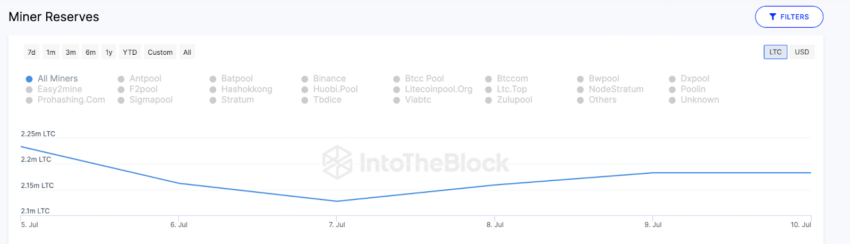 После покупки 300 000 монет в июне, майнеры начали избавляться от своих запасов Litecoin. Данные IntoTheBlock показывают, что с 5 по 11 июля они продали около 90 000 токенов.