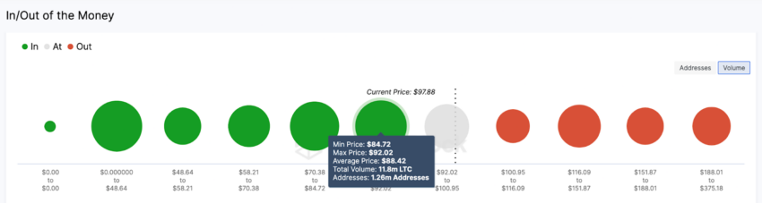 В случае закрепления выше $100 инициатива перейдет к быкам. Тем не менее, кластер из 572 000 кошельков, купивших 3,63 млн. LTC по минимальной цене $100,95, могут выйти из позиций в точке безубыточности и замедлить дальнейший рост.