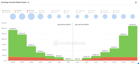 График глубины рынка платформы IntoTheBlock подтверждает медвежий прогноз. Согласно его данным, трейдеры выставили лимитные заявки на продажу 414 000 и покупку 411 000 LTC.