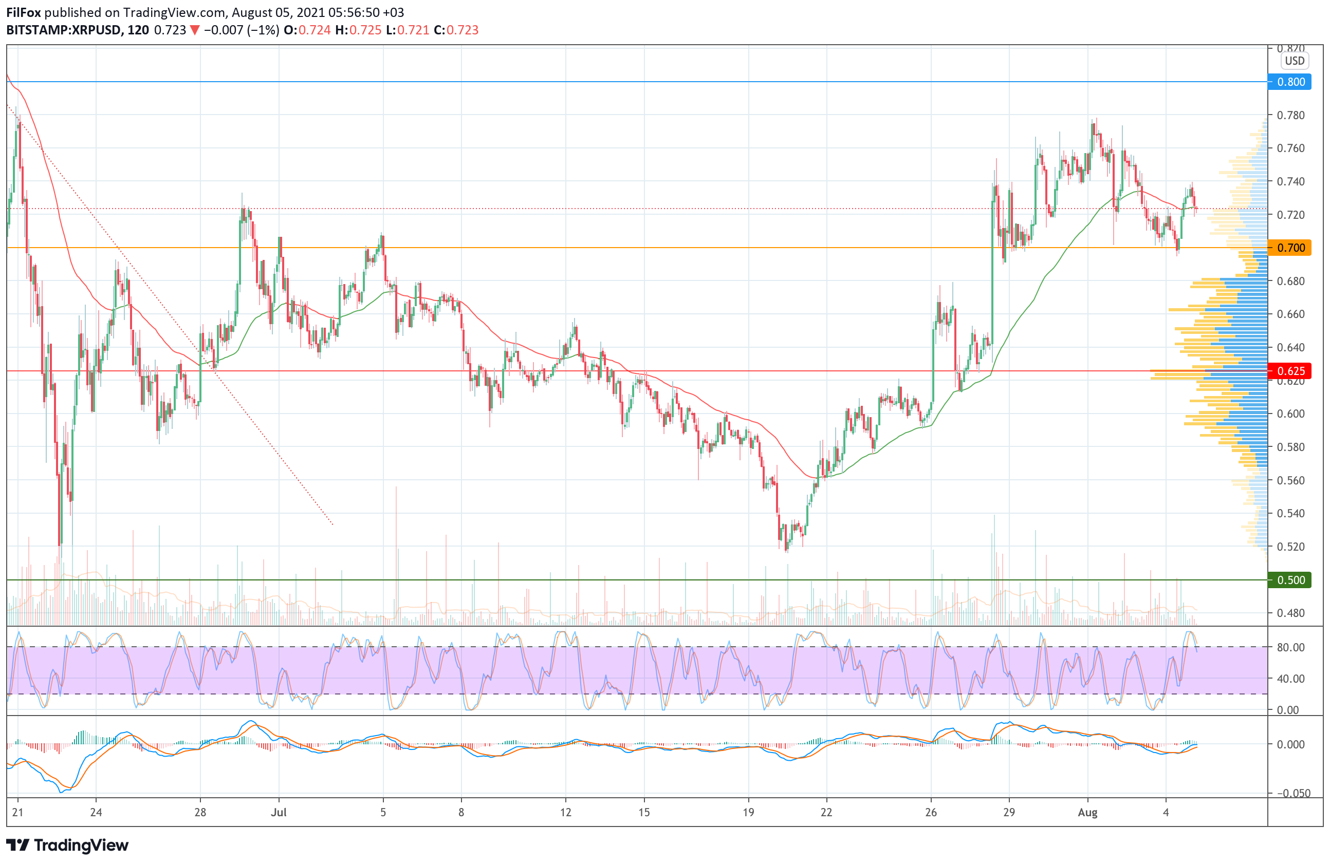 Вчера утром продавцы прокололи оранжевую поддержку 0.700 USD, но продолжить снижение цены XRP у них не получилось. Во второй половине дня покупатели перехватили инициативу и пара восстановилась в область средних цен.