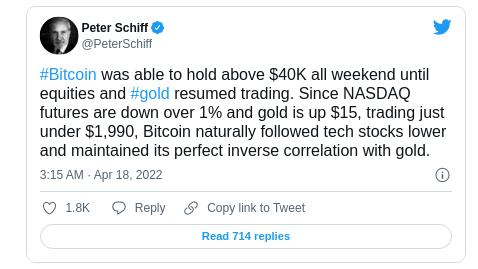 На этом фоне критик криптовалюты и сторонник золота Питер Шифф отметил, что биткоин коррелирует с акциями технологических компаний, а не с активами-убежищами.