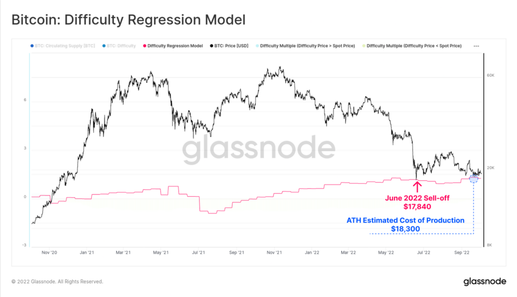 Логарифмическая регрессия между сложностью и рыночной капитализацией с R2-коэффициентом в 0,944 демонстрирует, что безубыточный уровень добычи биткоина по сектору в целом составляет $18 300. Это значение ненамного превышает достигнутый в июне минимум на отметке $17 840.